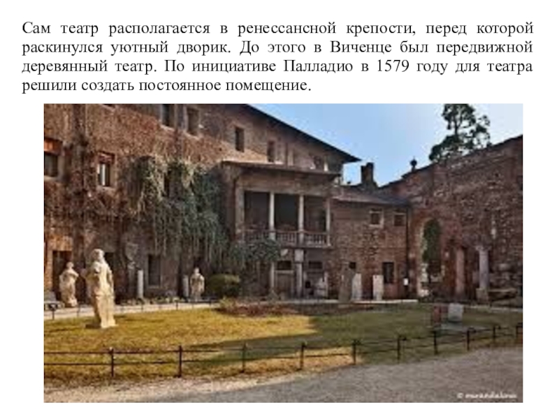Слайд 17Сам театр располагается в ренессансной крепости, перед которой раскинулся уютный дворик.