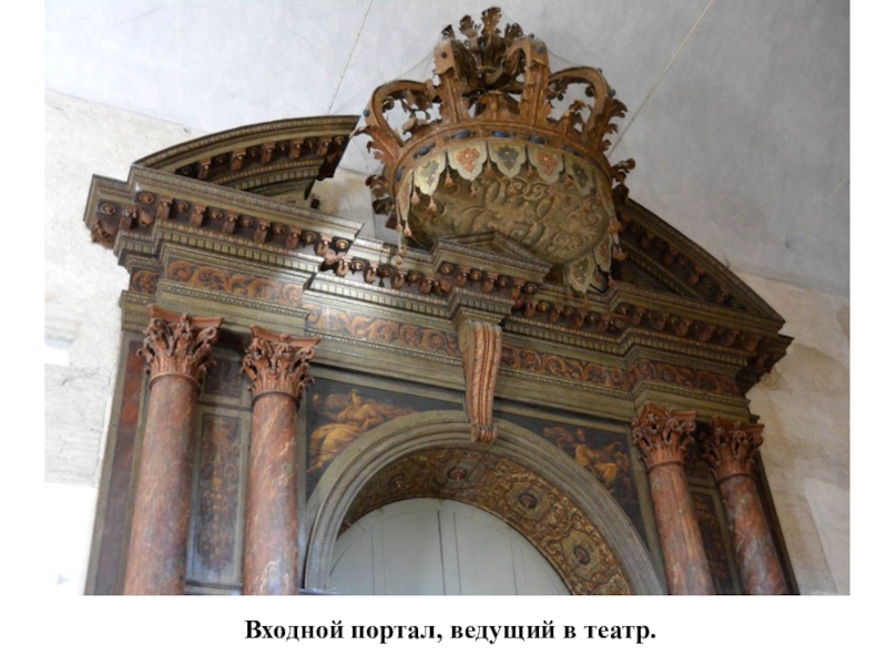 техническим нововведением. Портал сцены был украшен колоннами, пилястрами, скульптурами в нишах и своей пышностью напоминал портал театра Олимпико.
