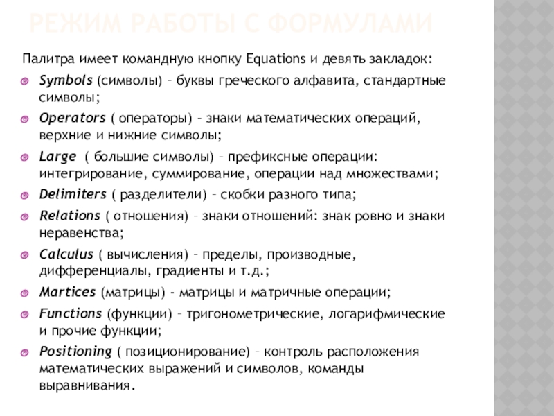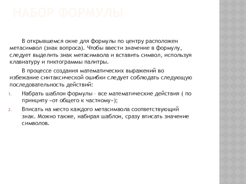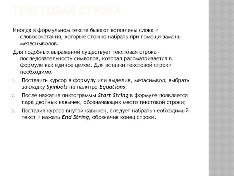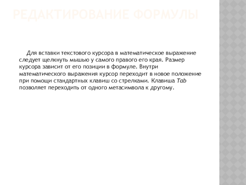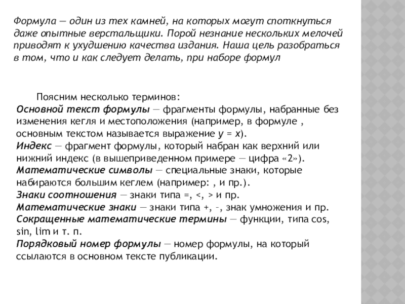 Основной текст формулы — фрагменты формулы, набранные без изменения кегля и местоположения (например, в формуле , основным текстом называется выражение y = x).
