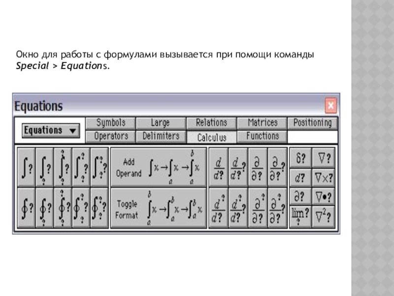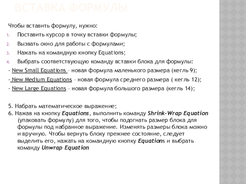 6. Нажав на кнопку Equations, выполнить команду Shrink-Wrap Equation (упаковать формулу) для того, чтобы подогнать размер блока для формулы под набранное выражение. Изменять размеры блока можно и вручную. Чтобы вернуть блоку прежнее состояние, следует выделить его, нажать на командную кнопку Equations и выбрать команду Unwrap Equation