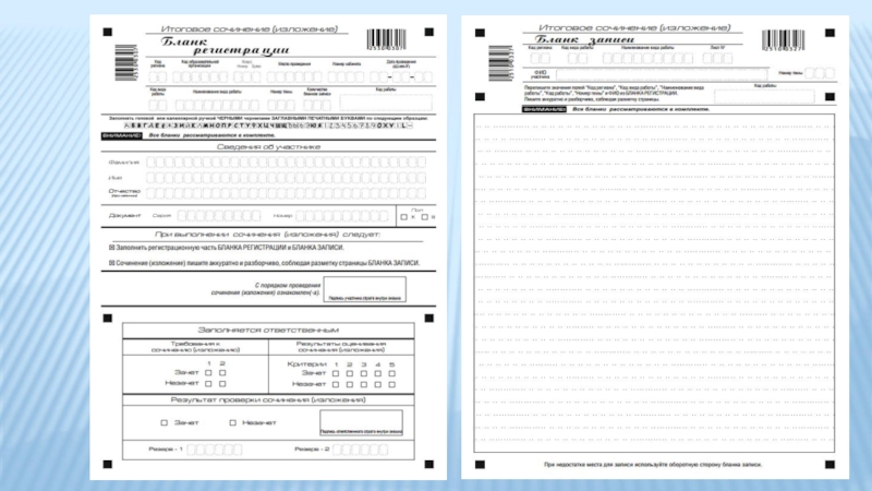 на рабочем столе участников итогового сочинения (изложения) находятся: бланк регистрации и бланк записи (дополнительного бланка записи),ручка (гелевая
