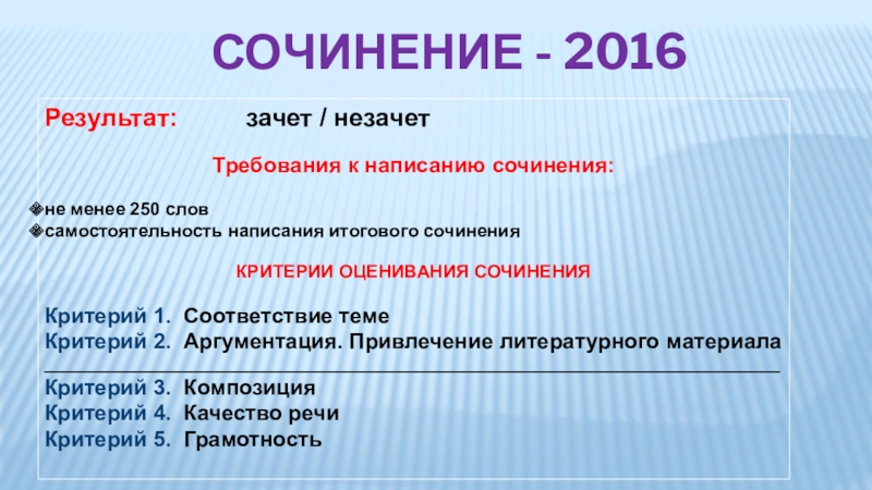 СОЧИНЕНИЕ - 2016Результат:        зачет / незачетТребования к написанию сочинения:не