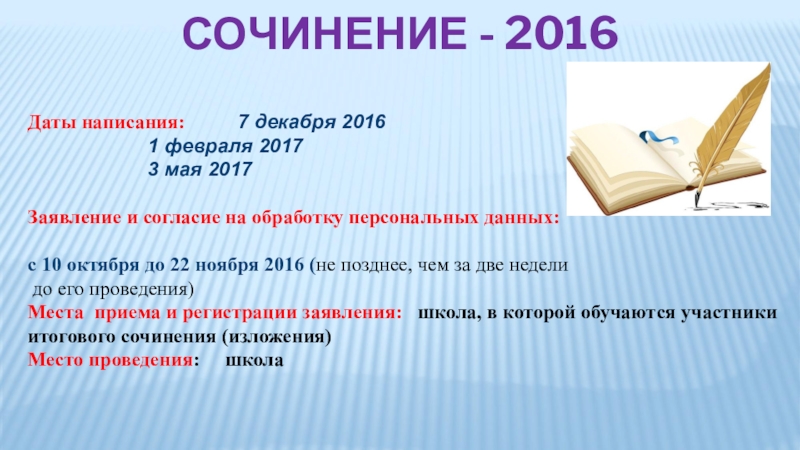 СОЧИНЕНИЕ - 2016Даты написания: 7 декабря 2016  1 февраля 2017  3 мая 2017Заявление и согласие на обработку персональных данных:с 10 октября до 22 ноября 2016 (не позднее, чем за две недели до его проведения)Места приема и регистрации