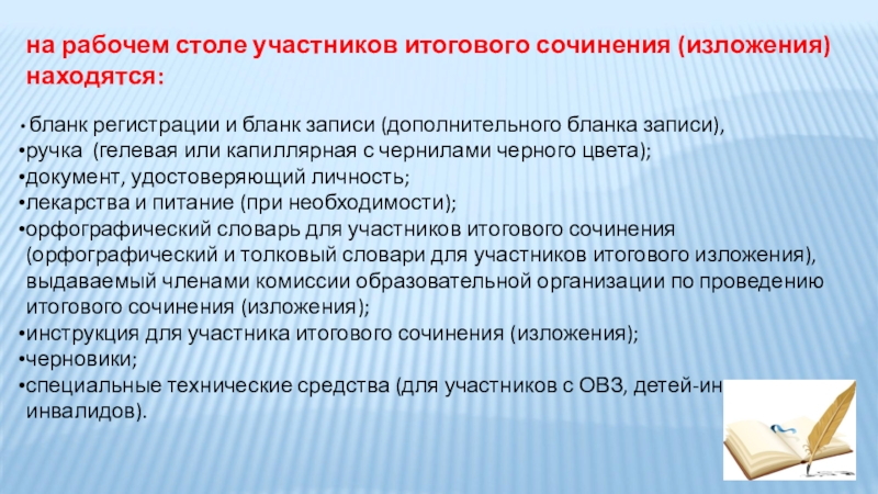 Слайд 4на рабочем столе участников итогового сочинения (изложения) находятся: