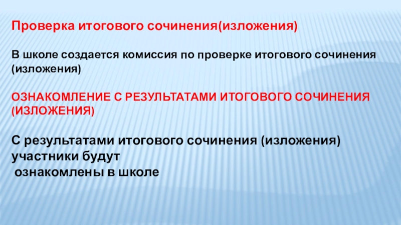 Проверка итогового сочинения(изложения)В школе создается комиссия по проверке итогового сочинения (изложения)ОЗНАКОМЛЕНИЕ С РЕЗУЛЬТАТАМИ ИТОГОВОГО СОЧИНЕНИЯ (ИЗЛОЖЕНИЯ)С результатами