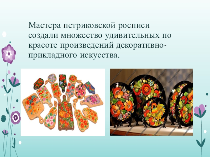 Слайд 9Мастера петриковской росписи создали множество удивительных по красоте произведений декоративно-прикладного искусства.