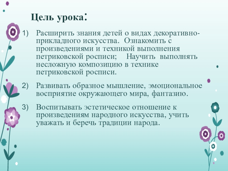 Цель урока:Расширить знания детей о видах декоративно-прикладного искусства. Ознакомить с произведениями и техникой выполнения петриковской росписи;