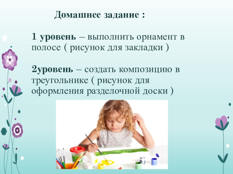 Домашнее задание :   1 уровень – выполнить орнамент в полосе (