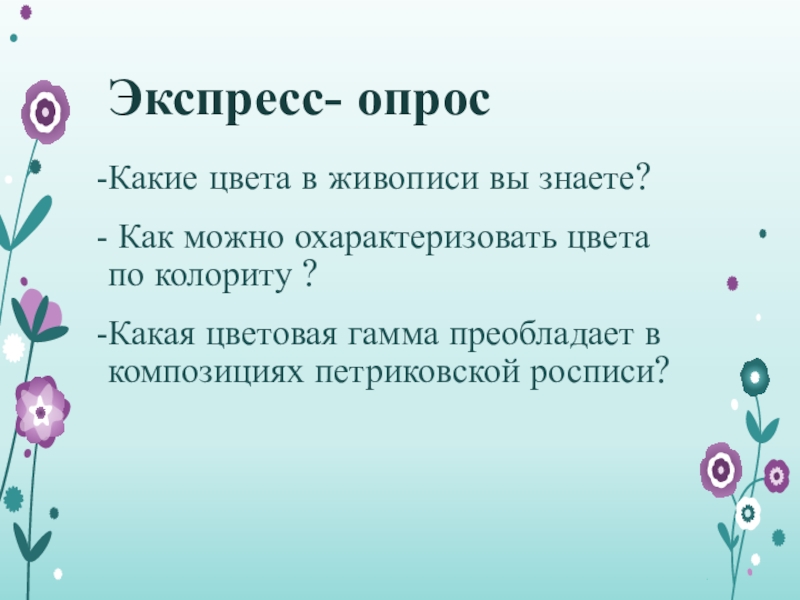 Экспресс- опросКакие цвета в живописи вы знаете? Как можно охарактеризовать цвета по колориту ?Какая цветовая гамма преобладает