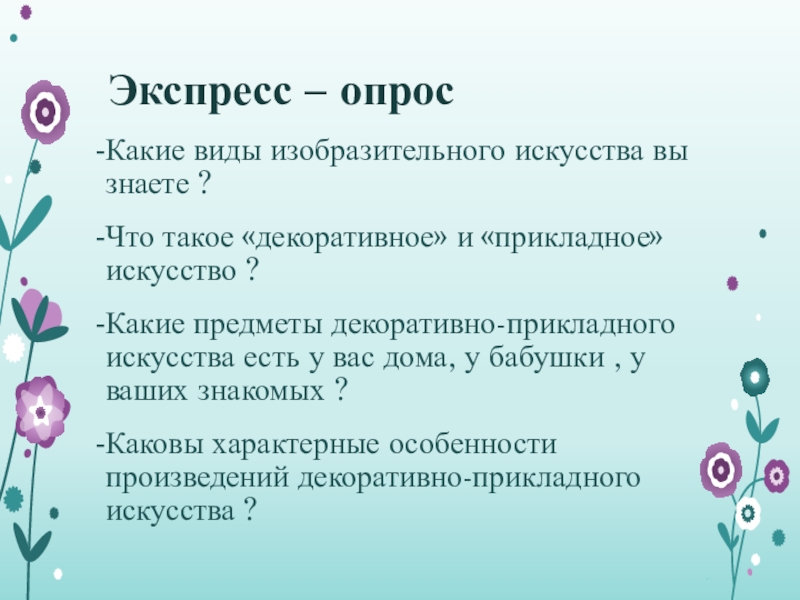 Экспресс – опрос Какие виды изобразительного искусства вы знаете ?Что такое «декоративное» и «прикладное» искусство ?Какие предметы