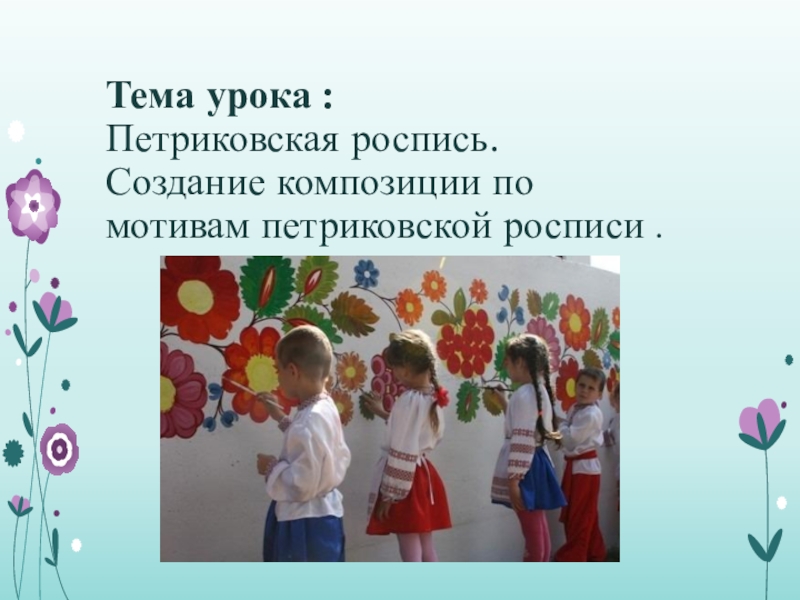 Слайд 2Тема урока : Петриковская роспись. Создание композиции по мотивам петриковской росписи .