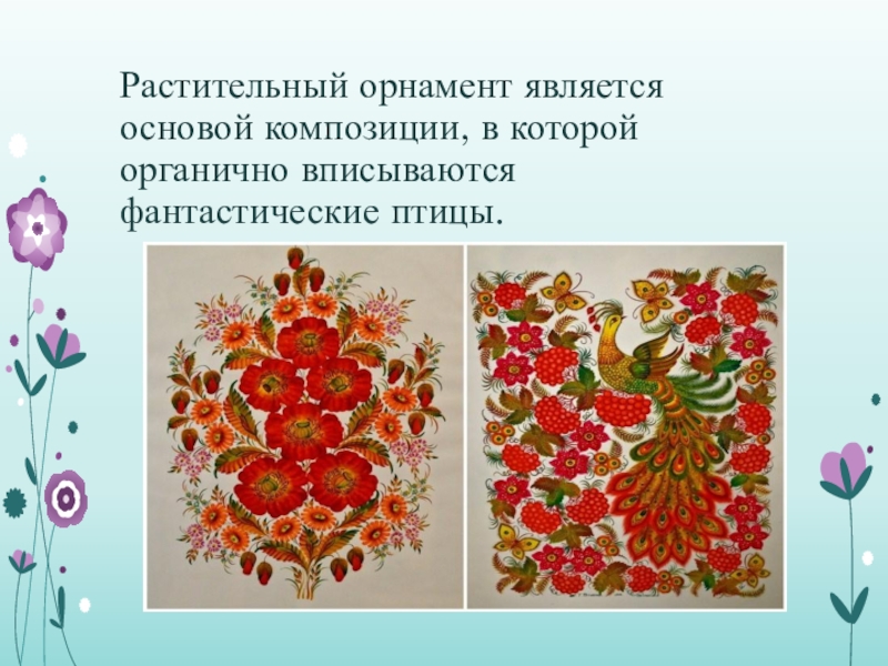 Слайд 11Растительный орнамент является основой композиции, в которой органично вписываются фантастические птицы.