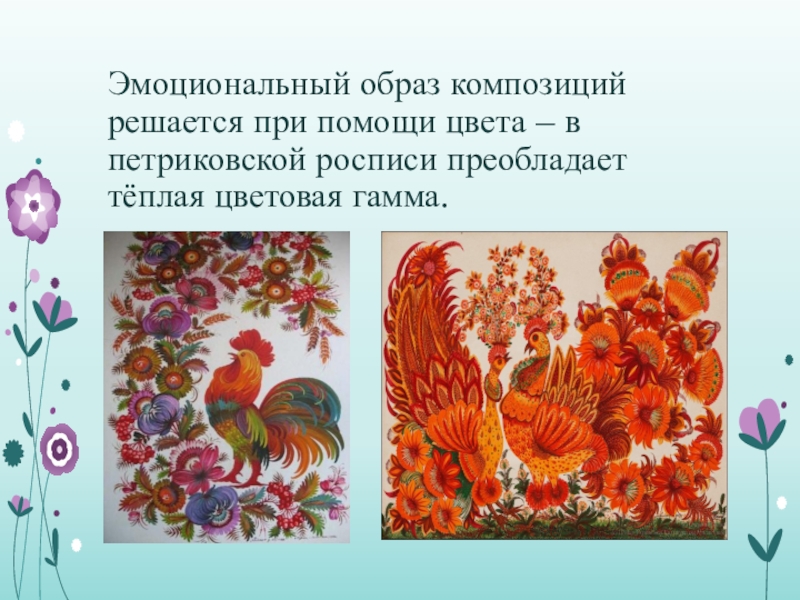 Слайд 7Эмоциональный образ композиций решается при помощи цвета – в петриковской росписи
