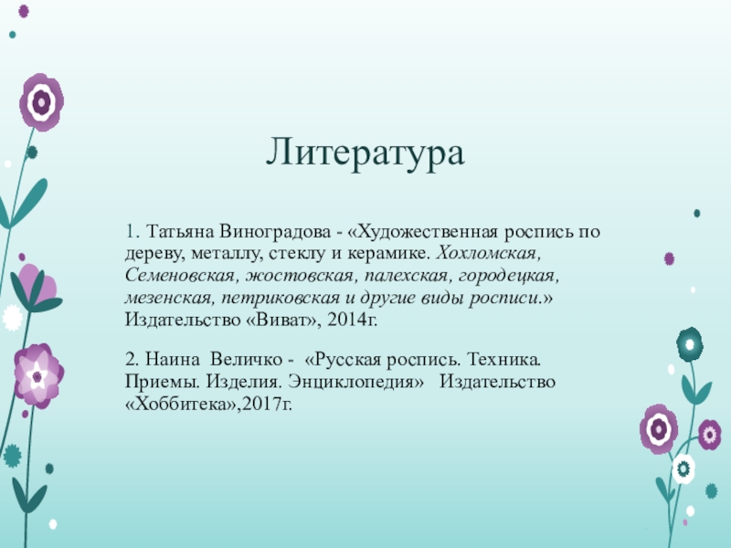Литература1. Татьяна Виноградова - «Художественная роспись по дереву, металлу, стеклу и керамике. Хохломская, Семеновская, жостовская, палехская, городецкая,