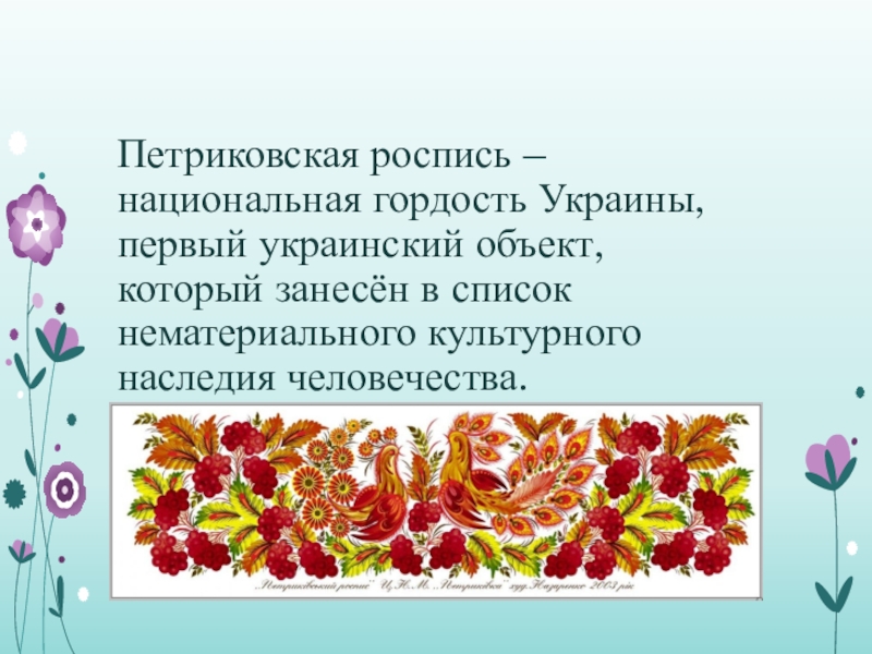 Слайд 5Петриковская роспись – национальная гордость Украины, первый украинский объект, который занесён