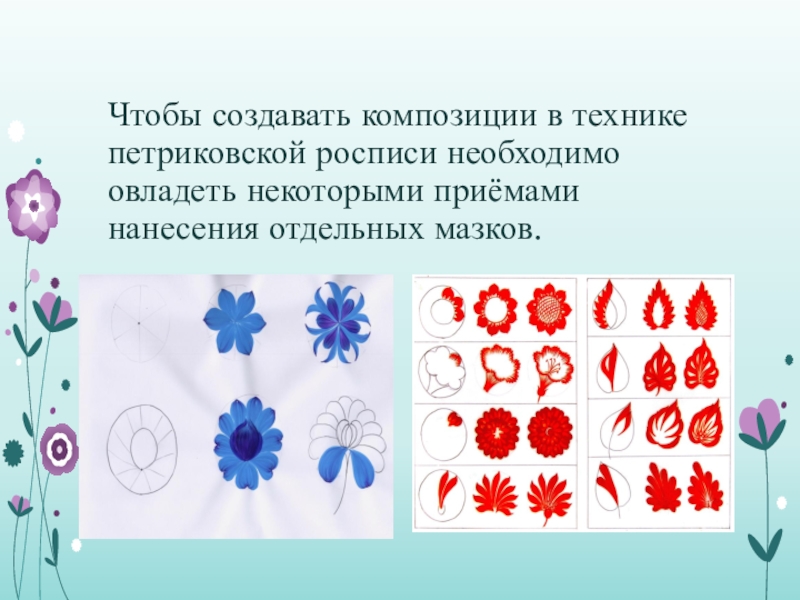 Слайд 12Чтобы создавать композиции в технике петриковской росписи необходимо овладеть некоторыми приёмами