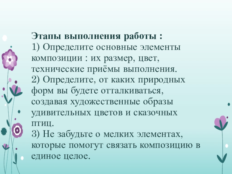 цвет, технические приёмы выполнения. 2) Определите, от каких природных форм вы будете отталкиваться, создавая художественные образы удивительных цветов и сказочных птиц. 3) Не забудьте о мелких элементах, которые помогут связать композицию в единое целое.