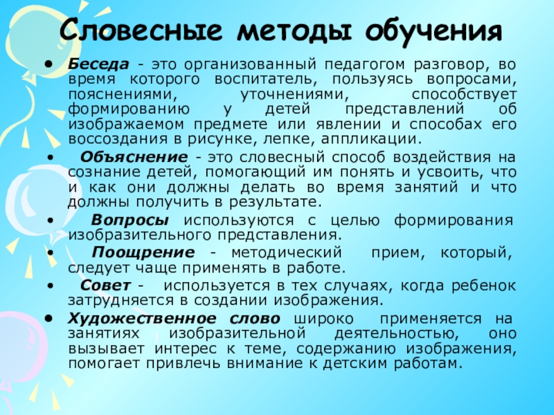Объяснение - это словесный способ воздействия на сознание детей, помогающий им понять и усвоить, что и как они должны делать во время занятий и что должны получить в результате.