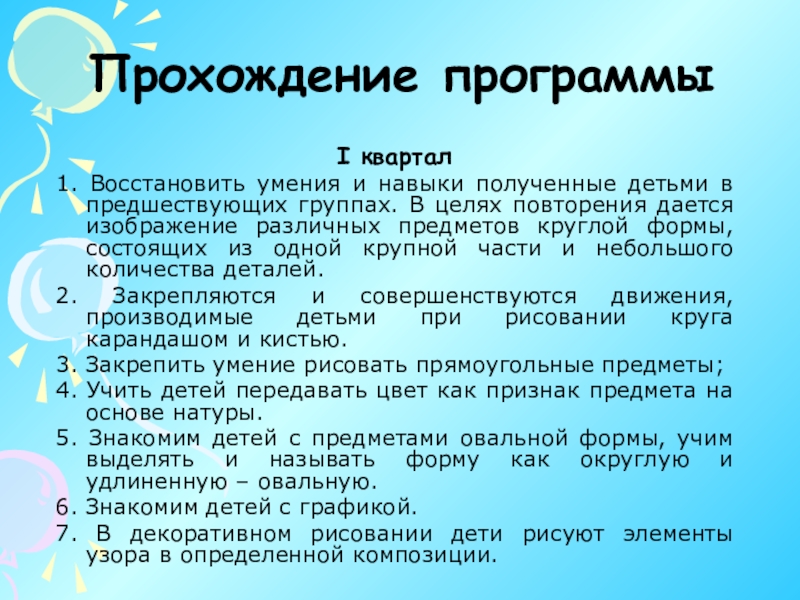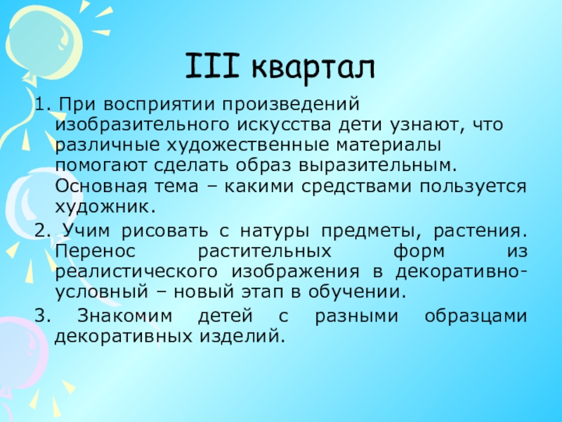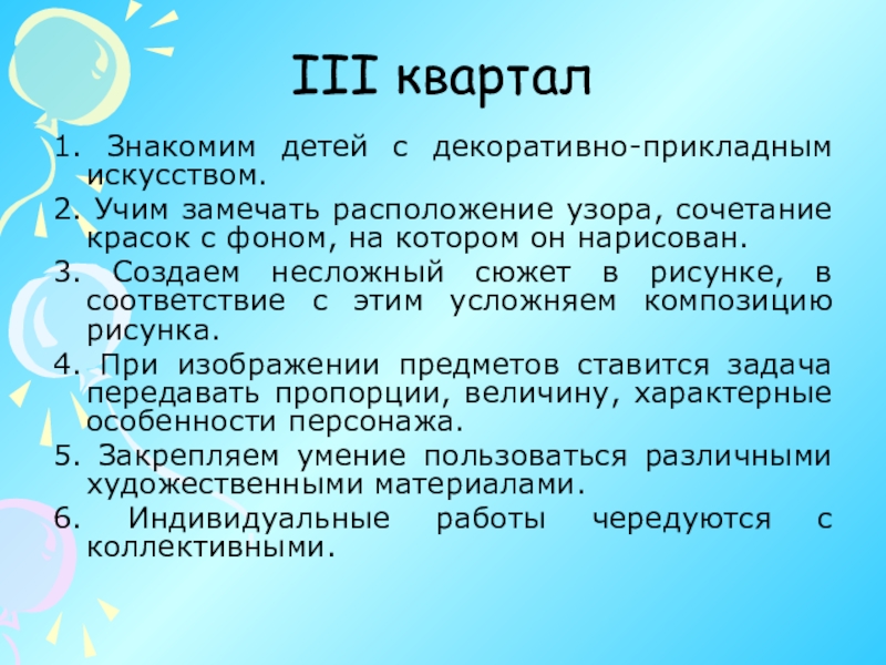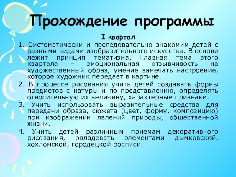 изобразительного искусства. В основе лежит принцип тематизма. Главная тема этого квартала – эмоциональная отзывчивость на художественный образ, умение замечать настроение, которое художник передает в картине.