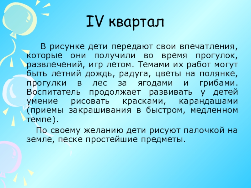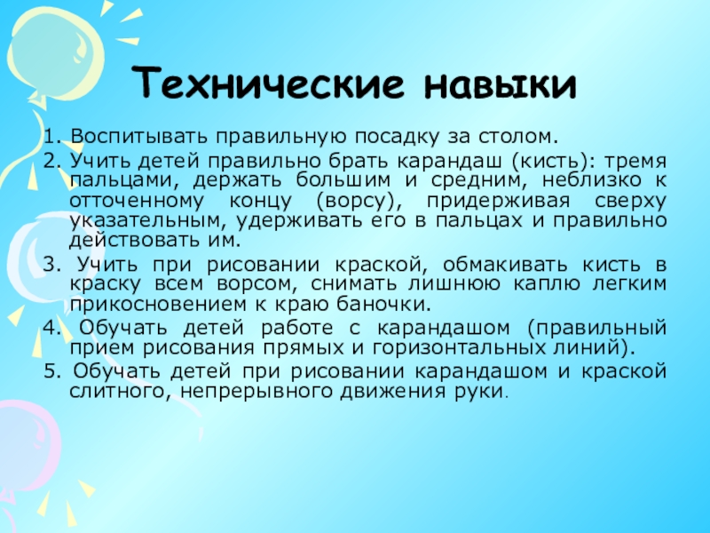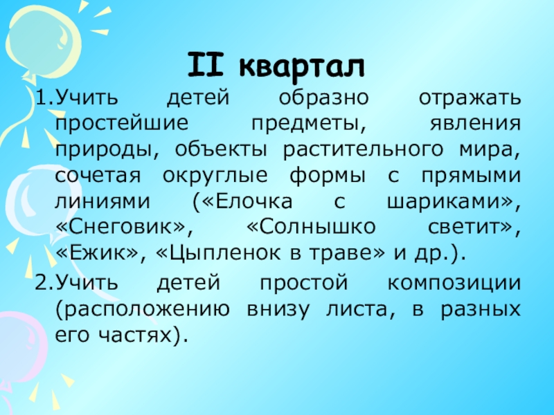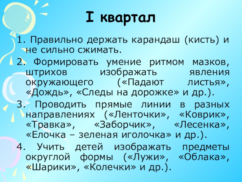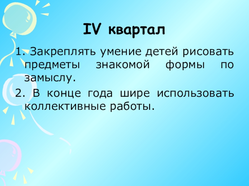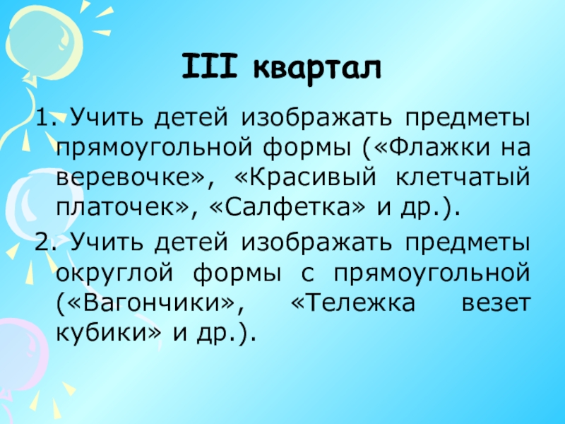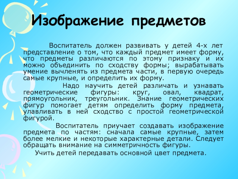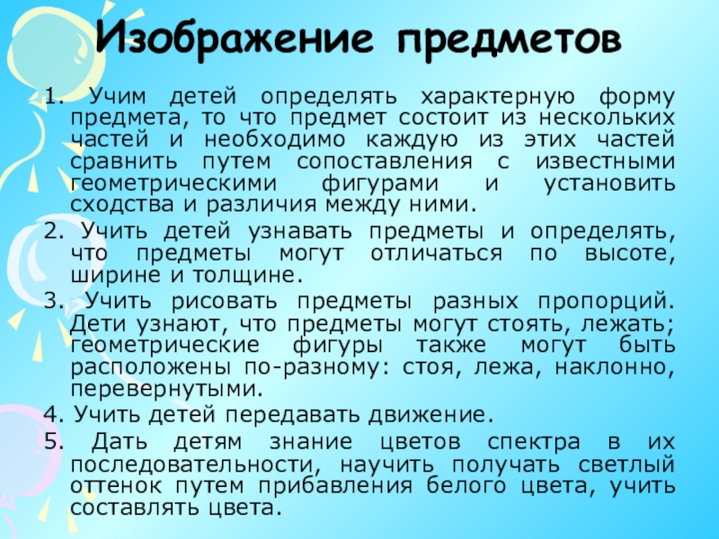3. Учить рисовать предметы разных пропорций. Дети узнают, что предметы могут стоять, лежать; геометрические фигуры также могут быть расположены по-разному: стоя, лежа, наклонно, перевернутыми.