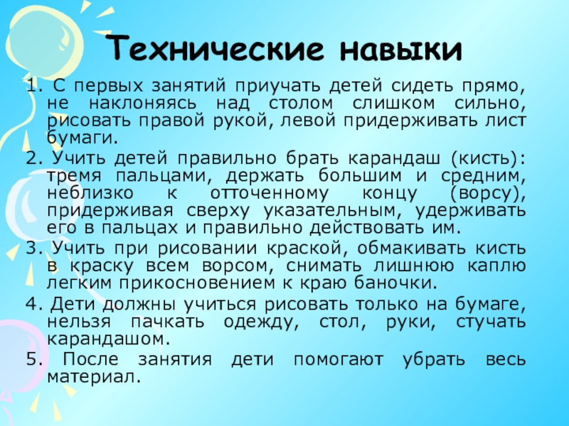 5. Отрабатываем легкое, без излишнего напряжения движение карандашом и кистью, умеренный нажим на бумагу карандашом.