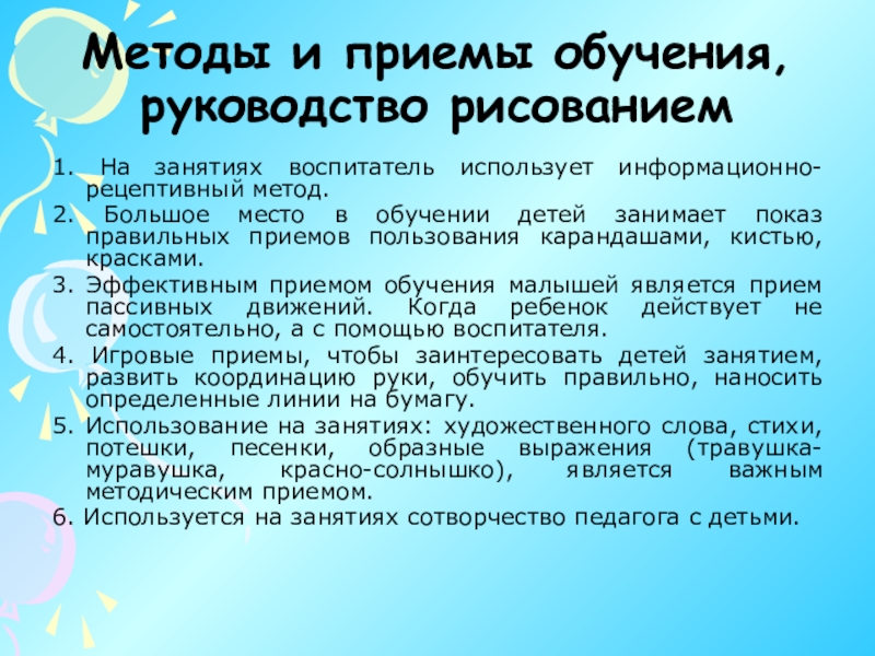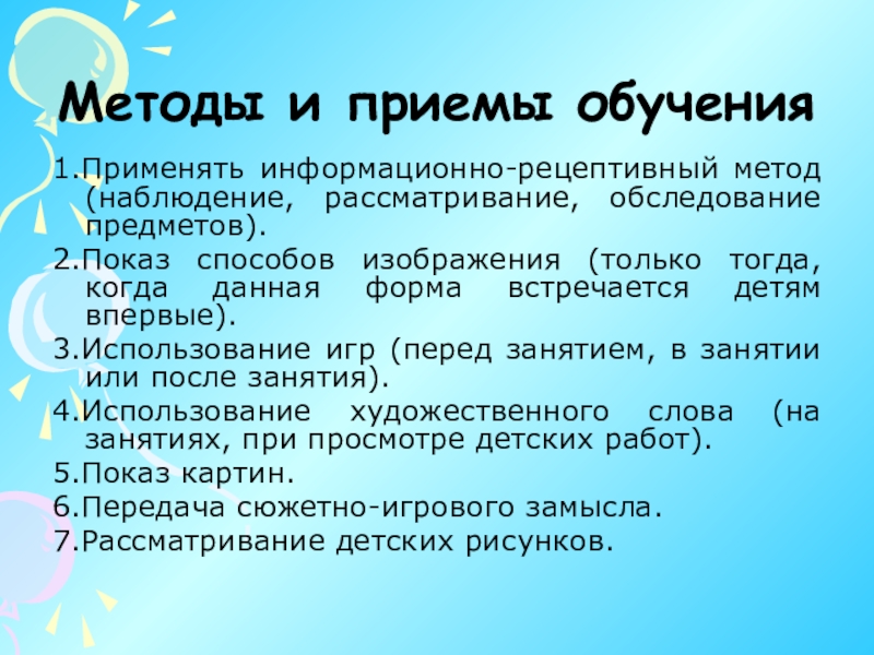 пути и средства, при помощи которых воспитатель сообщает детям знания, дает им умения, прививает навыки.
