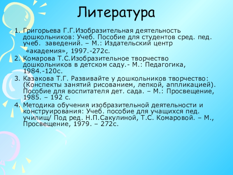 3. Казакова Т.Г. Развивайте у дошкольников творчество: (Конспекты занятий рисованием, лепкой, аппликацией). Пособие для воспитателя дет. сада. – М.: Просвещение, 1985. – 192 с.