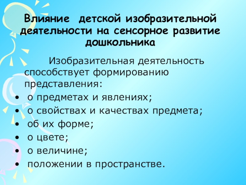 Слайд 7Влияние детской изобразительной деятельности на сенсорное развитие дошкольника