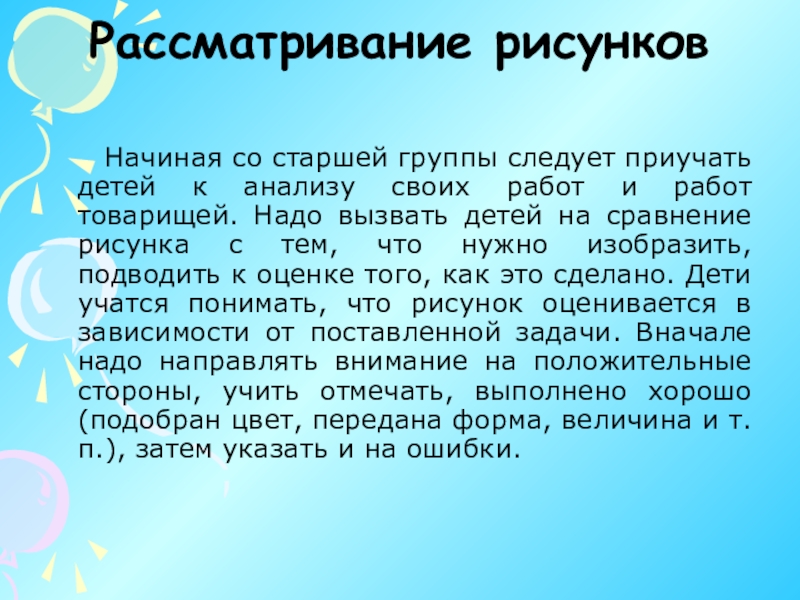 к анализу своих работ и работ товарищей. Надо вызвать детей на сравнение рисунка с тем, что нужно изобразить, подводить к оценке того, как это сделано. Дети учатся понимать, что рисунок оценивается в зависимости от поставленной задачи. Вначале надо направлять внимание на положительные стороны, учить отмечать, выполнено хорошо (подобран цвет, передана форма, величина и т.п.), затем указать и на ошибки.