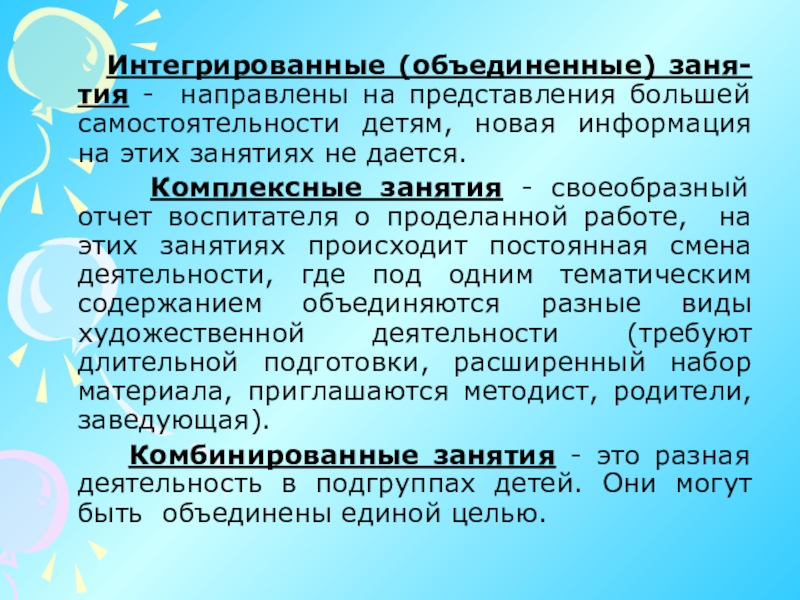 Слайд 19 Интегрированные (объединенные) заня-тия - направлены на представления большей