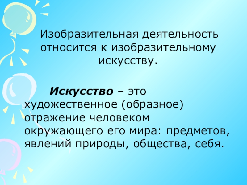 Искусство – это художественное (образное) отражение человеком окружающего его мира: предметов, явлений природы, общества, себя.