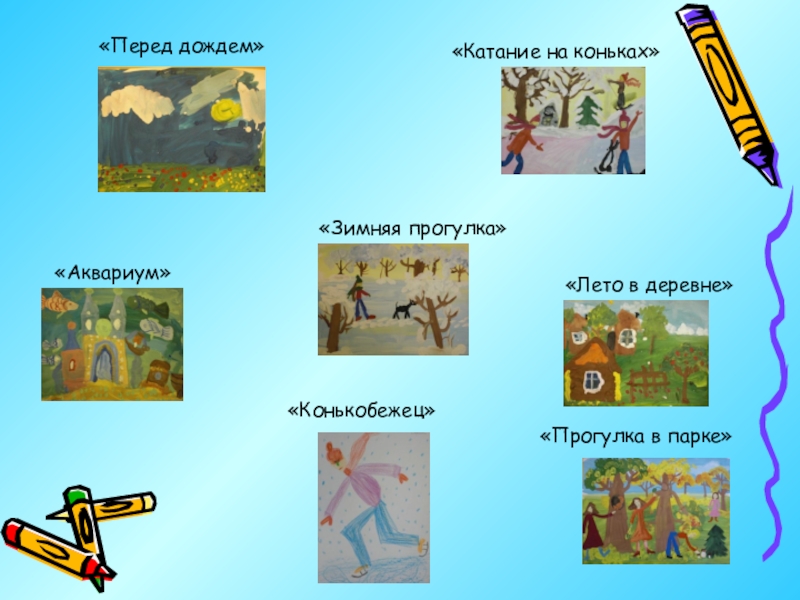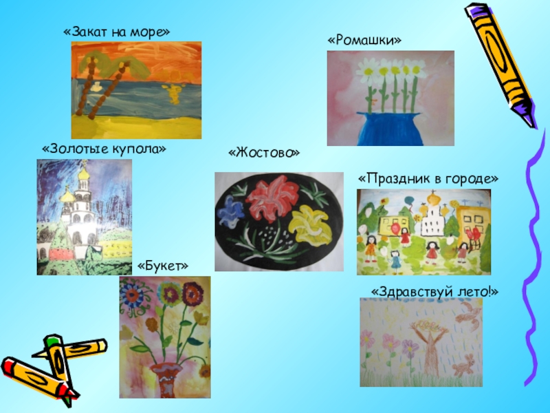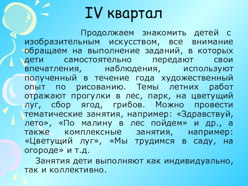 все внимание обращаем на выполнение заданий, в которых дети самостоятельно передают свои впечатления, наблюдения, используют полученный в течение года художественный опыт по рисованию. Темы летних работ отражают прогулки в лес, парк, на цветущий луг, сбор ягод, грибов. Можно провести тематические занятия, например: «Здравствуй, лето», «По малину в лес пойдем» и др., а также комплексные занятия, например: «Цветущий луг», «Мы трудимся в саду, на огороде» и т.д.
