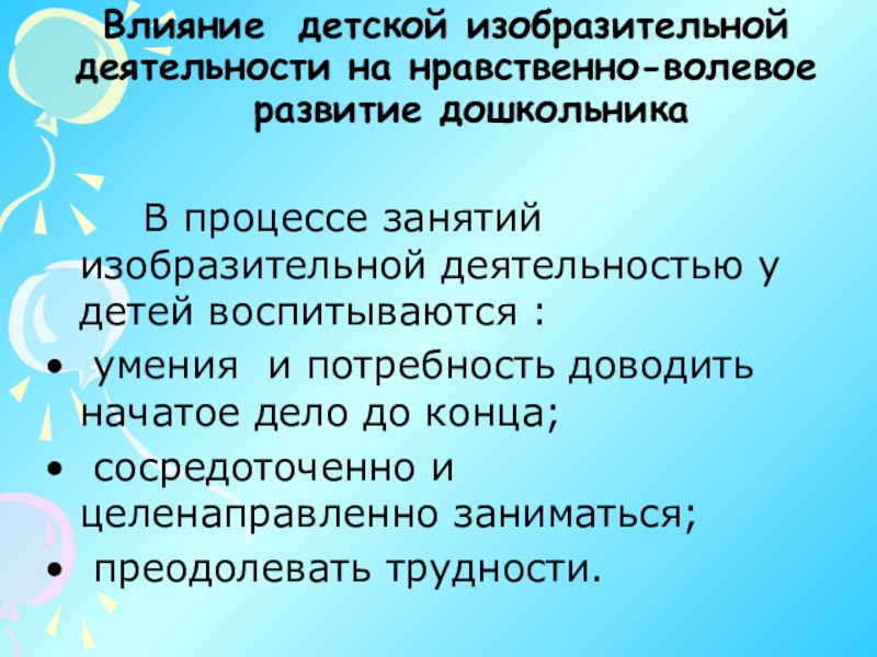 Слайд 8Влияние детской изобразительной деятельности на нравственно-волевое
