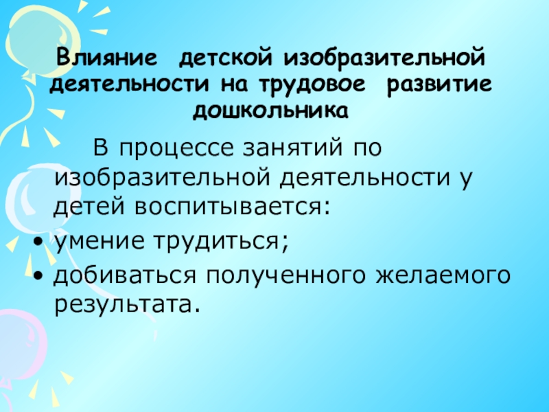 Слайд 9Влияние детской изобразительной деятельности на трудовое развитие дошкольника