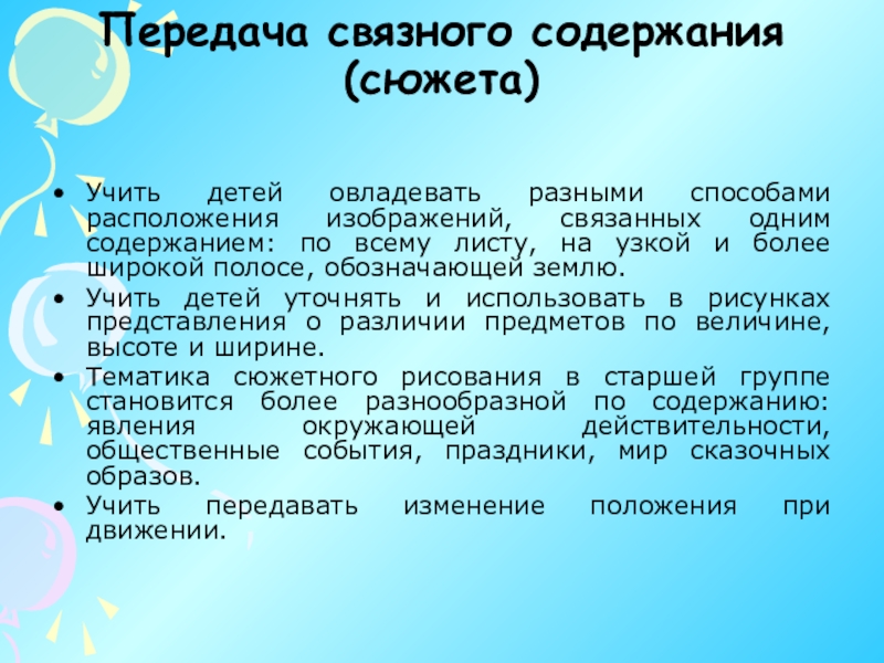 Тематика сюжетного рисования в старшей группе становится более разнообразной по содержанию: явления окружающей действительности, общественные события, праздники, мир сказочных образов.