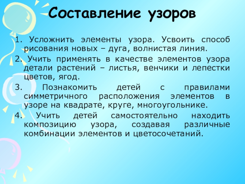 2. Учить применять в качестве элементов узора детали растений – листья, венчики и лепестки цветов, ягод.
