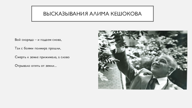 Высказывания Алима КешоковаВой снаряда – и падаем снова,Так с боями полмира прошли,Смерть к земле прижимала, а словоОтрывало