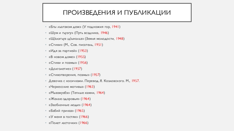 Произведения и публикации«Бгы лъапэхэм деж» (У подножия гор, 1941)«Шум и гъуэгу» (Путь всадника, 1946)«Щӏалэгъуэ щӏыналъэ» (Земля молодости,