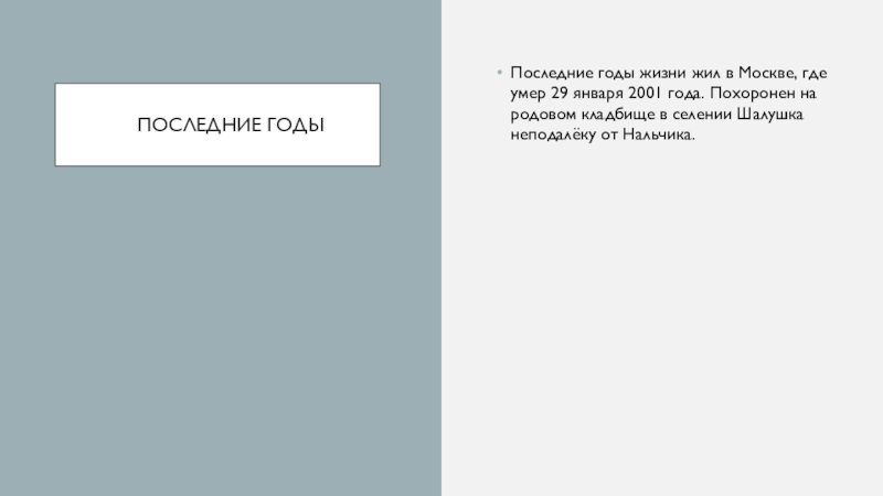 2001 года. Похоронен на родовом кладбище в селении Шалушка неподалёку от Нальчика.