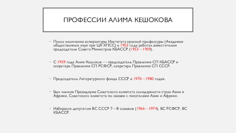 Профессии Алима КешоковаПосле окончания аспирантуры Института красной профессуры (Академия общественных наук при ЦК КПСС) в 1953 году