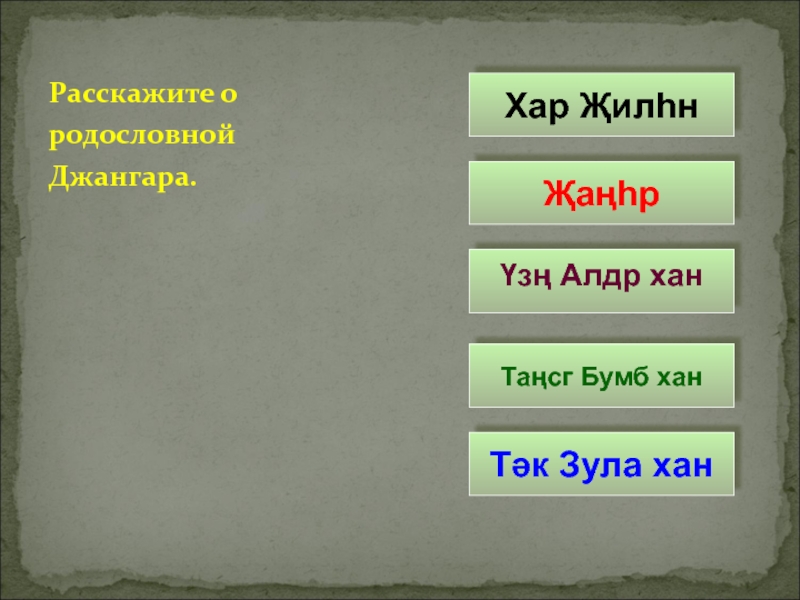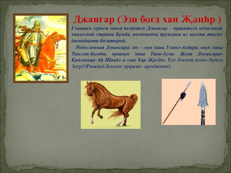 Родословная Джангара: он – сын хана Узюнг-Алдара, внук хана Тангсак-Бумбы, правнук хана Таки-Зулы. Жена Джангара-Красавица Аh Шавдл и сын Хар Җилhн. Его боевой конь-Арнзл Зеерд(Рыжко).Боевое оружие- арм(копье)