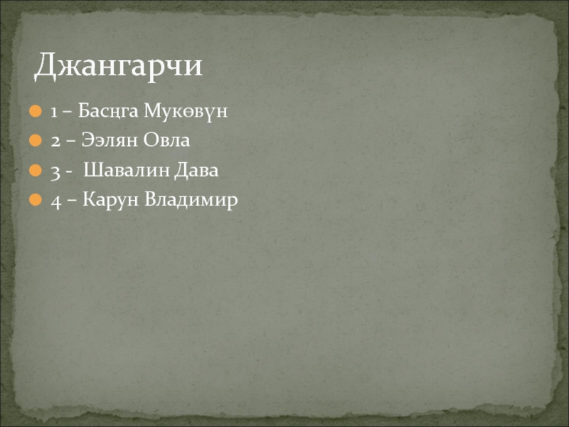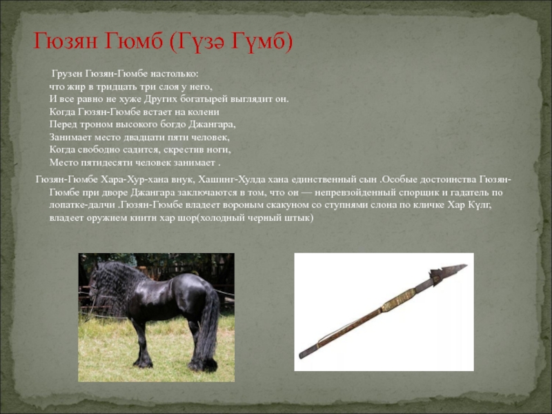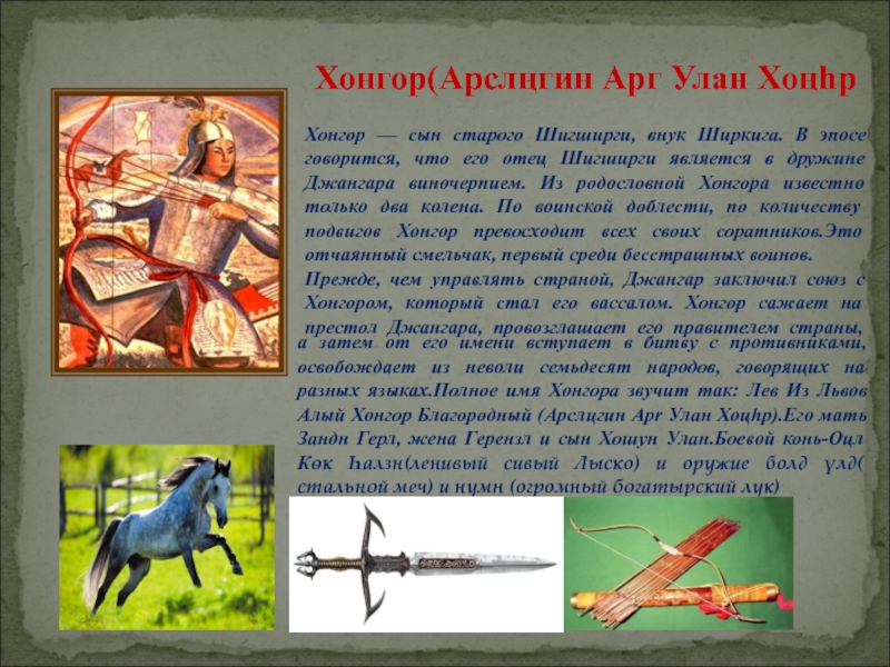 а затем от его имени вступает в битву с противниками, освобождает из неволи семьдесят народов, говорящих на разных языках.Полное имя Хонгора звучит так: Лев Из Львов Алый Хонгор Благородный (Арслцгин Apr Улан Хоцһр).Его мать Зандн Герл, жена Герензл и сын Хошун Улан.Боевой конь-Оцл Көк Һалзн(ленивый сивый Лыско) и оружие болд үлд( стальной меч) и нумн (огромный богатырский лук)