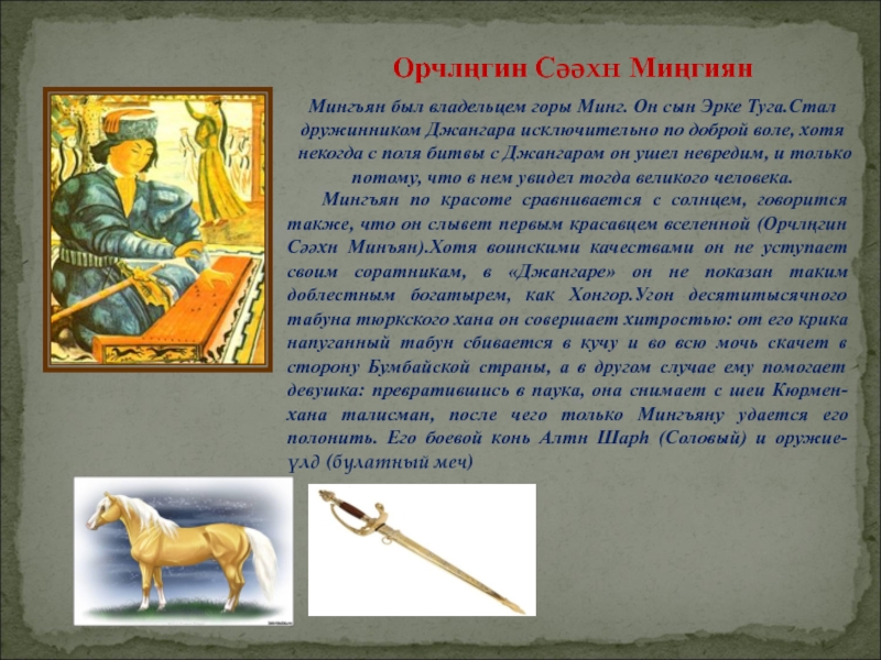 Мингъян по красоте сравнивается с солнцем, говорится также, что он слывет первым красавцем вселенной (Орчлңгин Сәәхн Минъян).Хотя воинскими качествами он не уступает своим соратникам, в «Джангаре» он не показан таким доблестным богатырем, как Хонгор.Угон десятитысячного табуна тюркского хана он совершает хитростью: от его крика напуганный табун сбивается в кучу и во всю мочь скачет в сторону Бумбайской страны, а в другом случае ему помогает девушка: превратившись в паука, она снимает с шеи Кюрмен-хана талисман, после чего только Мингъяну удается его полонить. Его боевой конь Алтн Шарh (Соловый) и оружие- үлд (булатный меч)