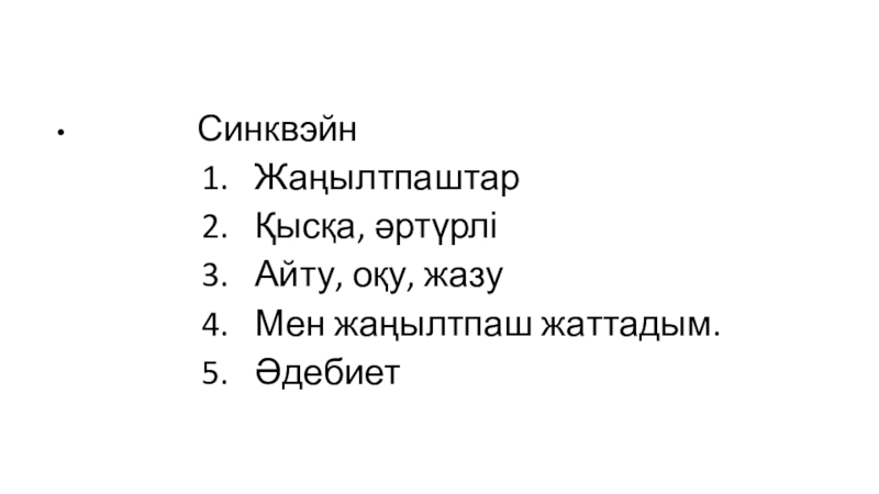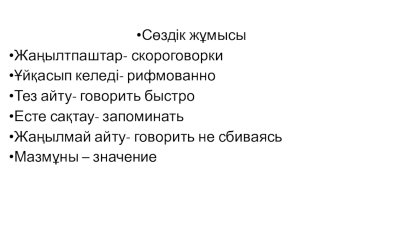 Сөздік жұмысыЖаңылтпаштар- скороговоркиҰйқасып келеді- рифмованноТез айту- говорить быстроЕсте сақтау- запоминатьЖаңылмай айту- говорить не сбиваясьМазмұны – значение