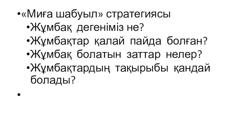 «Миға шабуыл» стратегиясыЖұмбақ дегеніміз не?Жұмбақтар қалай пайда болған?Жұмбақ болатын заттар нелер?Жұмбақтардың тақырыбы қандай болады?