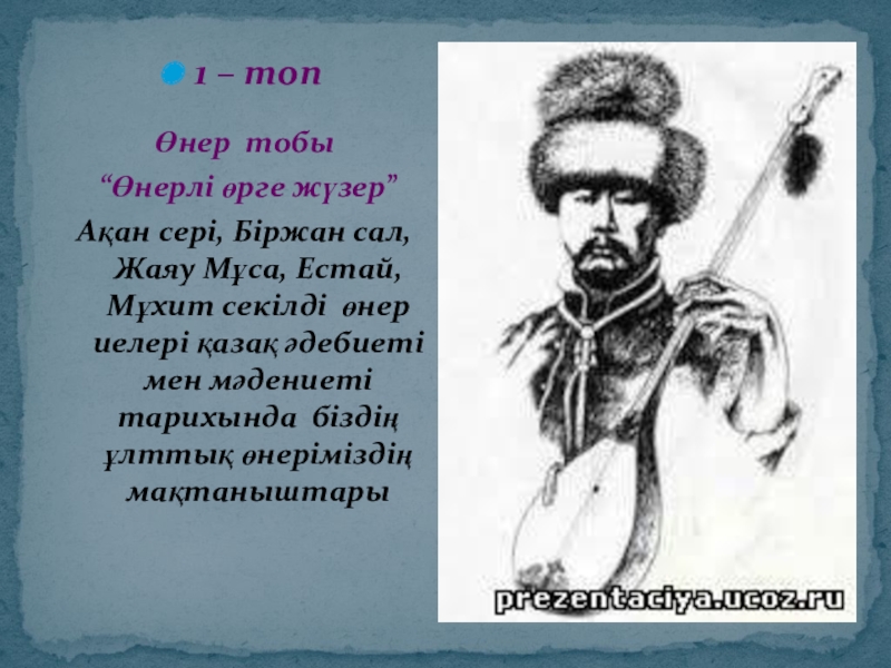 1 – топ Өнер тобы “Өнерлі өрге жүзер”Ақан сері, Біржан сал, Жаяу Мұса, Естай, Мұхит секілді өнер