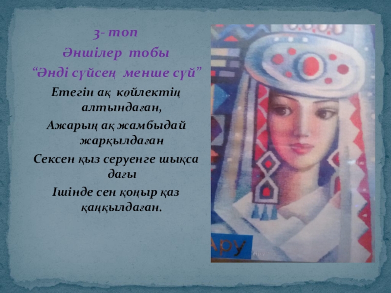 3- топ Әншілер тобы“Әнді сүйсең менше сүй”Етегін ақ көйлектің алтындаған,Ажарың ақ жамбыдай жарқылдаған Сексен қыз серуенге шықса