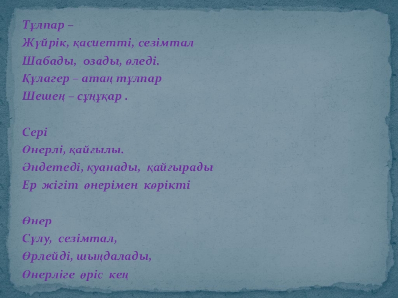 Тұлпар – Жүйрік, қасиетті, сезімталШабады, озады, өледі. Құлагер – атаң тұлпар Шешең – сұңұқар . Сері Өнерлі,