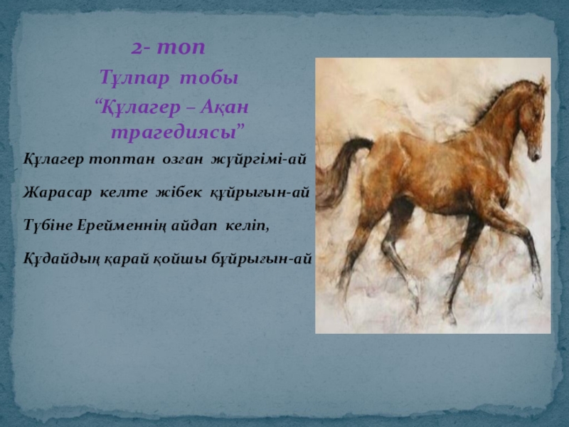 2- топ Тұлпар тобы “Құлагер – Ақан трагедиясы”Құлагер топтан озған жүйргімі-ай Жарасар келте жібек құйрығын-айТүбіне Ерейменнің айдап