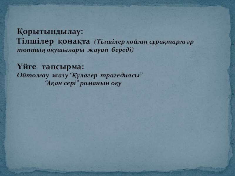 тапсырма: Ойтолғау жазу “Құлагер трагедиясы” “Ақан сері” романын оқу
